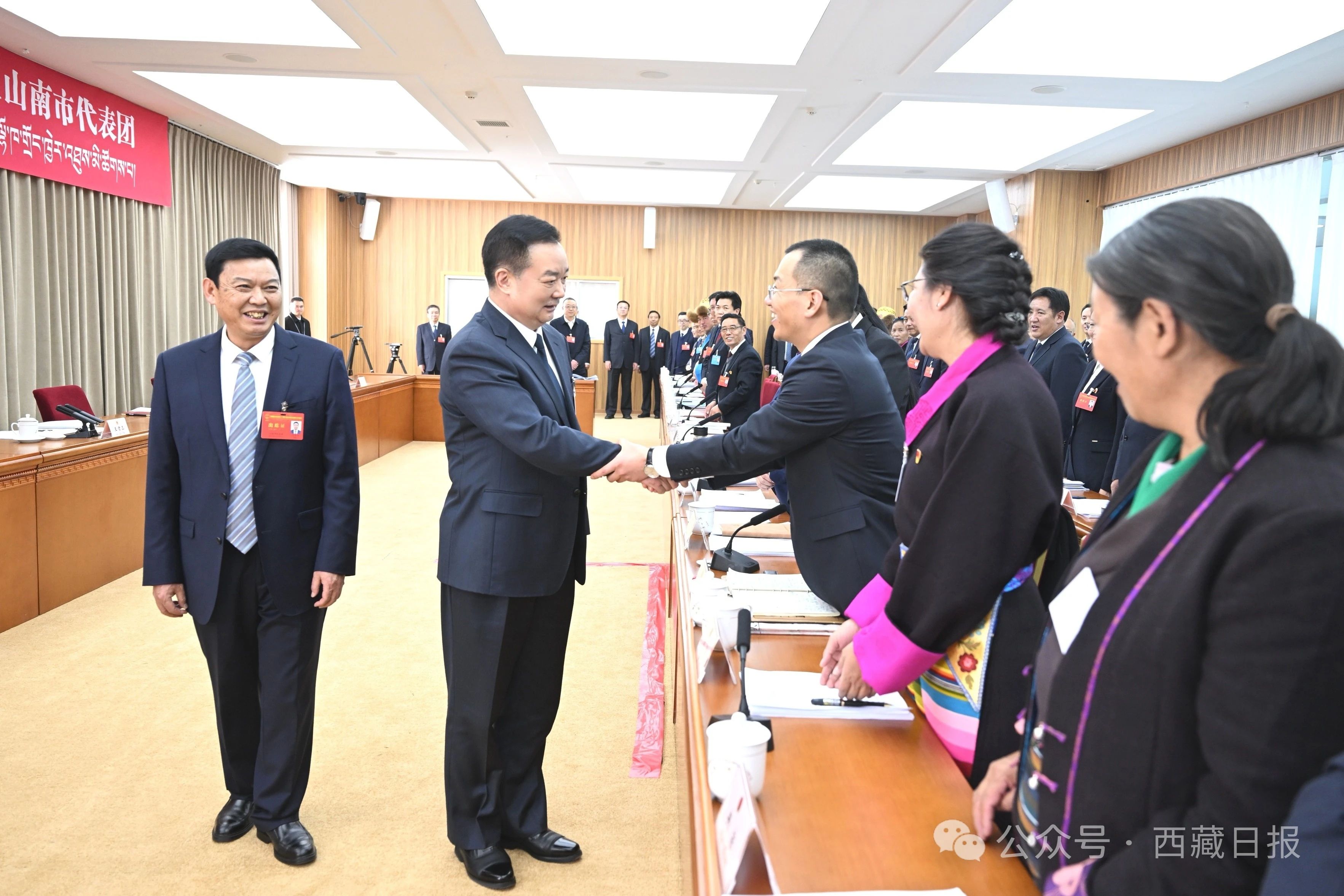 1月20日下午,自治区党委书记王君正参加自治区十二届人大三次会议山南代表团审议。这是王君正与人大代表们亲切握手。记者 旦增西旦 摄