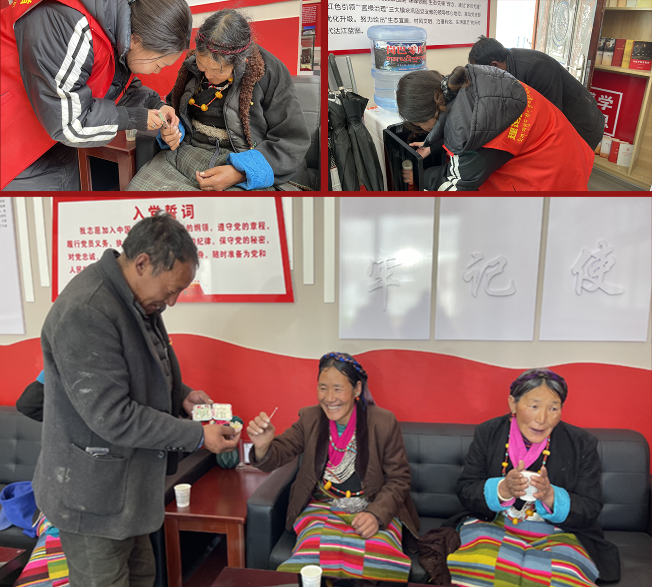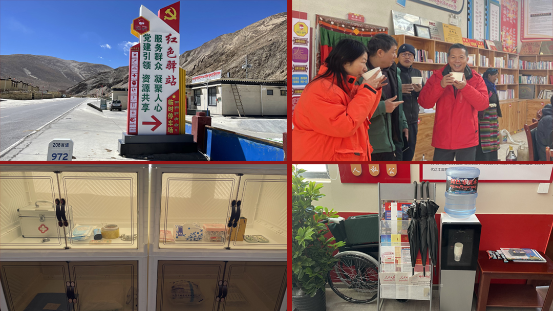 达江村“石榴籽”红色驿站内提供“冷可取暖、热可纳凉、渴可喝水、急可如厕、累可歇脚、伤可用药”的便捷贴心服务,另配有报刊书架、免费充电、免费WiFi、爱心雨伞、图书阅览、护理包、针线包、轮椅、临时停车以及多媒体一体机党课学习等服务项目全心全意为游客群众服务,推动党员志愿服务有形化、常态化。达江村村民群众也主动邀请游客品尝糌粑、酥油茶等特色食物,互学家乡话。