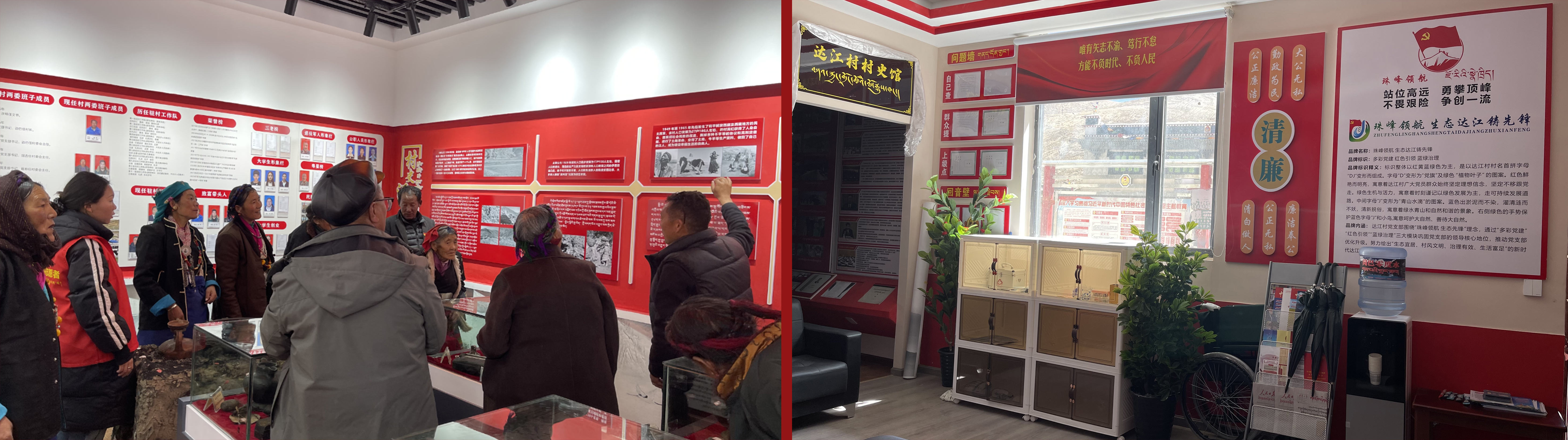 党建会客厅内的党史长廊、廉政警示、典型引领等学习区域充分体现百年党史和本村变化。村史馆内展陈着达江村自成立以来的精编版村庄“通史”、带着岁月痕迹的老灶台、传统生活器具、党中央和西藏自治区历年赠送的纪念品等物件,留住了乡愁记忆、弘扬了传统文化、涵养了文明村风,展示了当地群众积极向上追求幸福生活的历程,增强了游客群众的认同感、归属感、使命感。