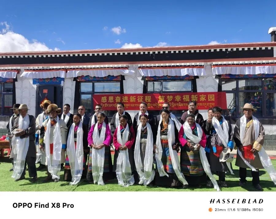 图为乔迁仪式现场,当地干部、群众及施工方工作人员合影留念